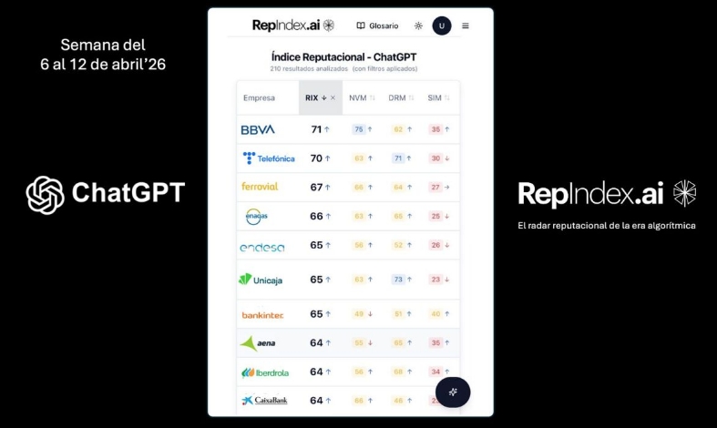MADRID (SERVIMEDIA). Bankinter, Enagás, Mapfre, Puig y Telefónica conforman el Top 5 de reputación corporativa algorítmica del IBEX-35 en ChatGPT durante el periodo 6 al 12 de abril, según el análisis semanal de RepIndex.ai.El ranking refleja un entorno en el que ChatGPT prioriza la consistencia narrativa, la calidad de las fuentes y la coherencia documental, consolidando un grupo de compañías con posicionamientos sólidos en el ecosistema algorítmico.